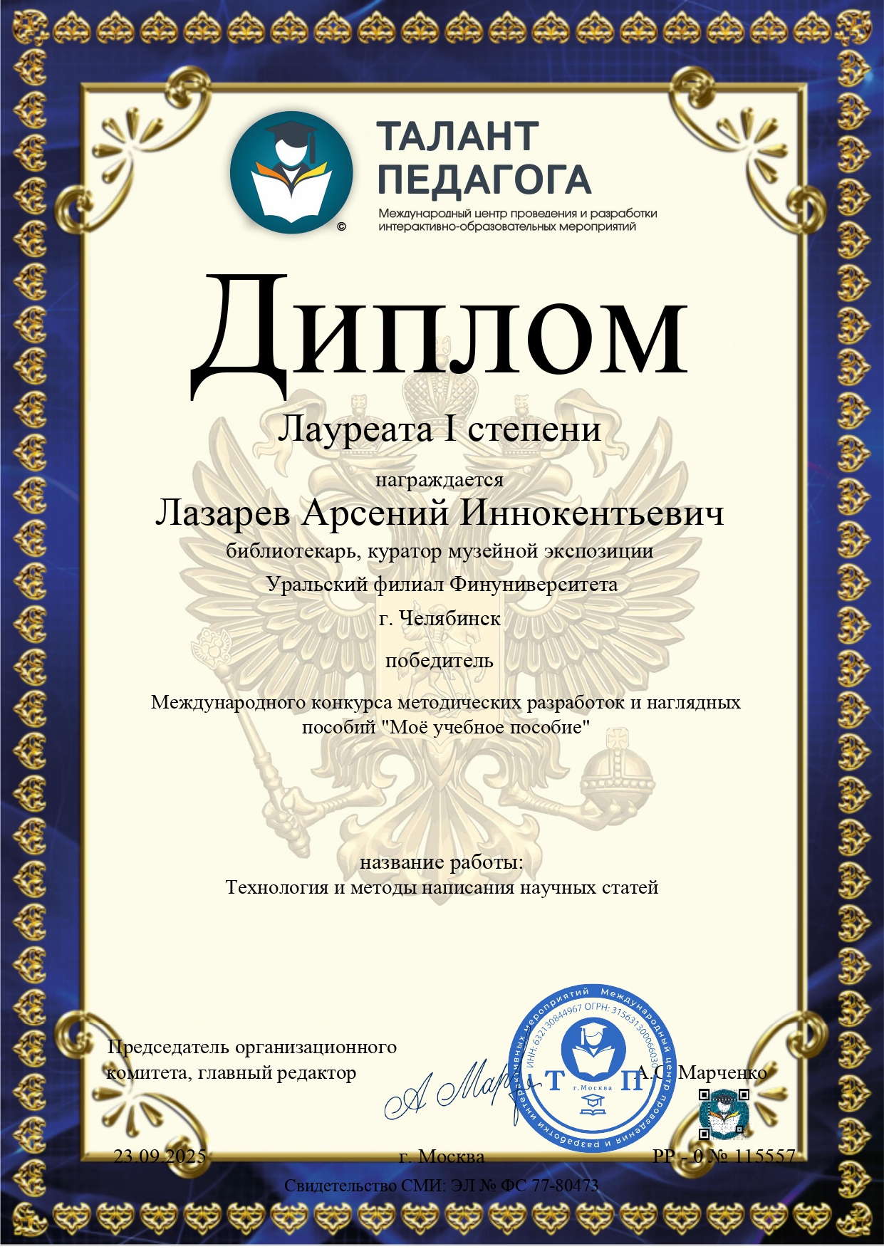 Сертификат докладчика конференции