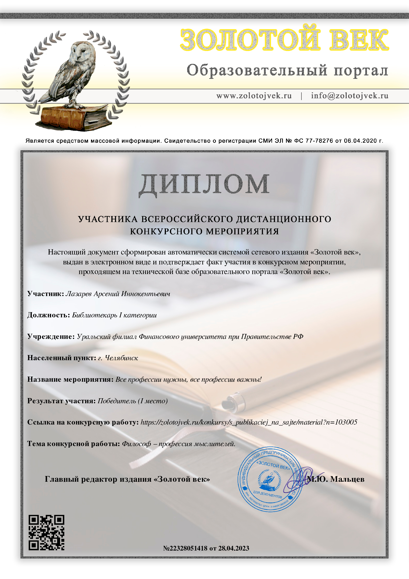 Диплом победителя конкурса