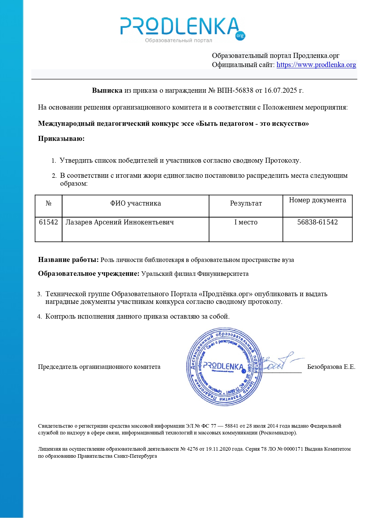 Выписка из приказа о награждении