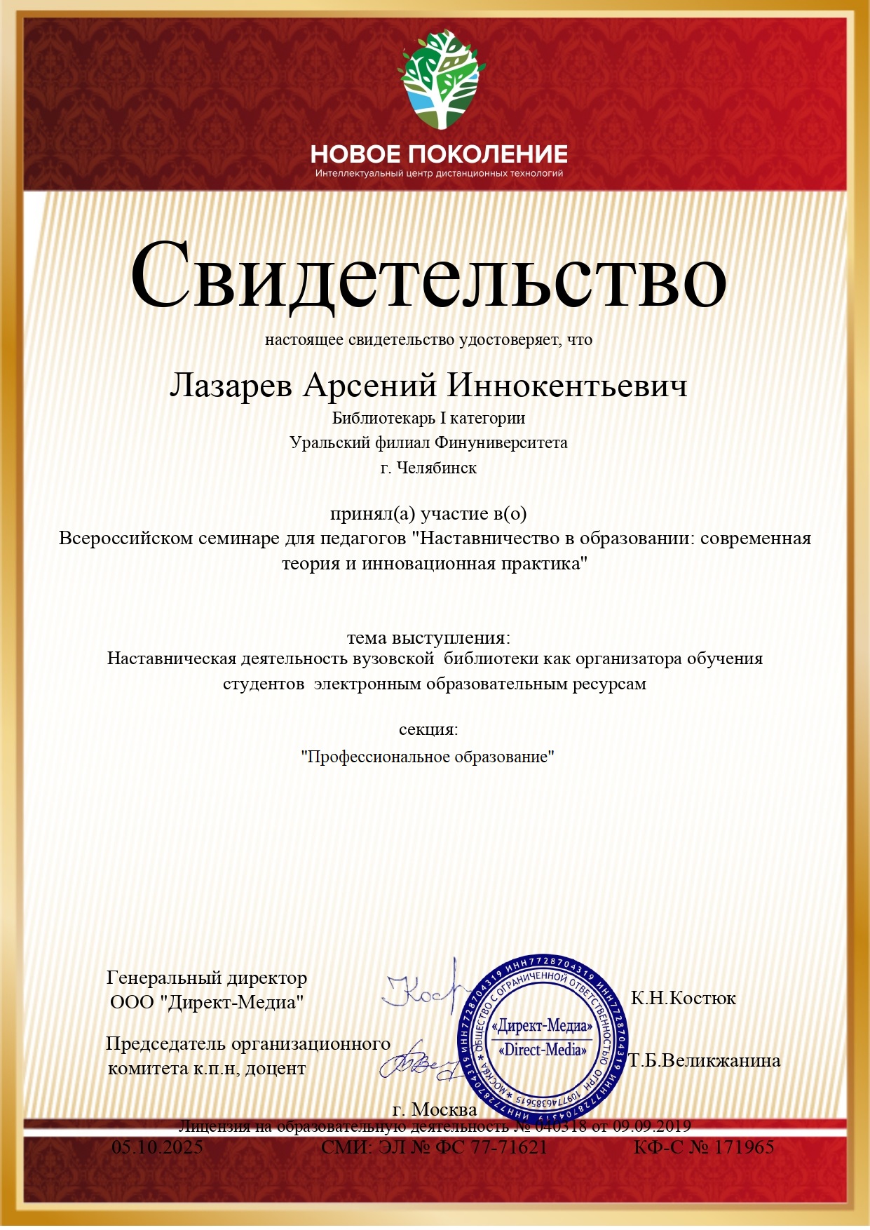 Свидетельство участника семинара