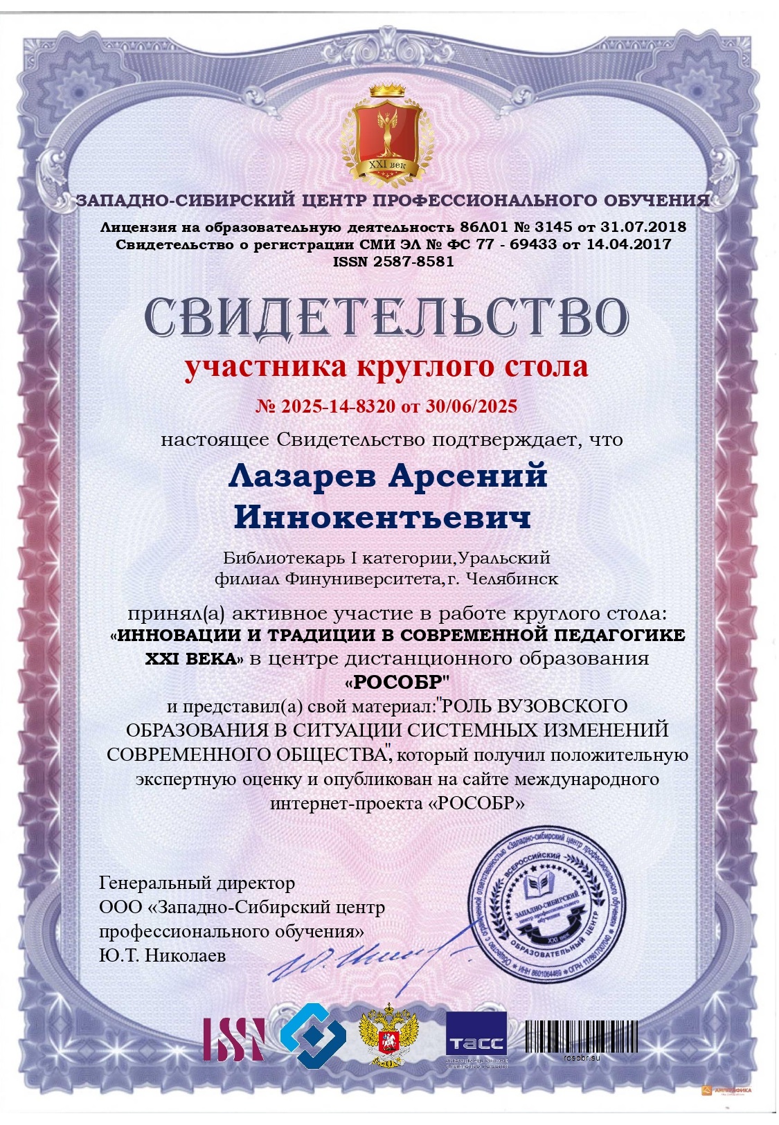 Сертификат участника круглого стола