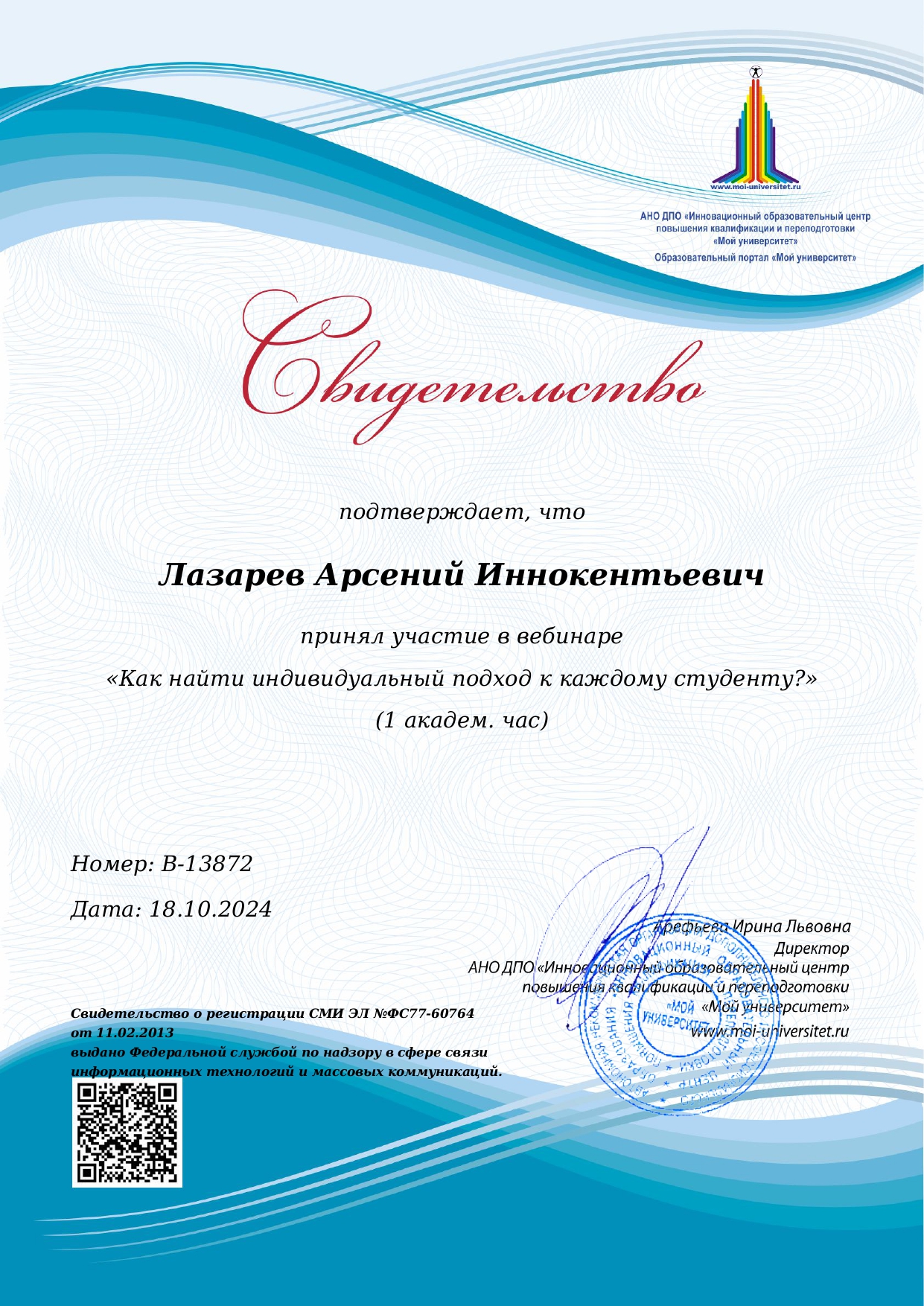 Свидетельство участника вебинара "Как найти индивидуальный подход к студенту?" (образовательный центр "Мой университет", 18.10.2024)