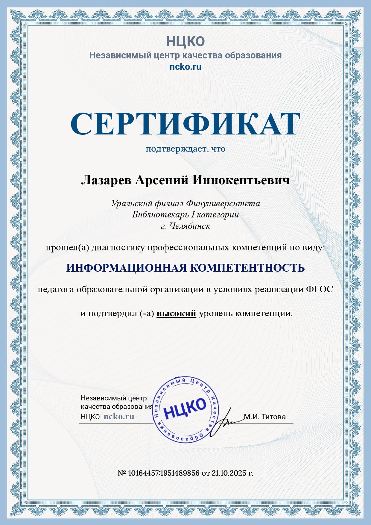 Сертификат о прохождении диагностики информационной компетентности работника образования (НЦКО, 21.10.2025)