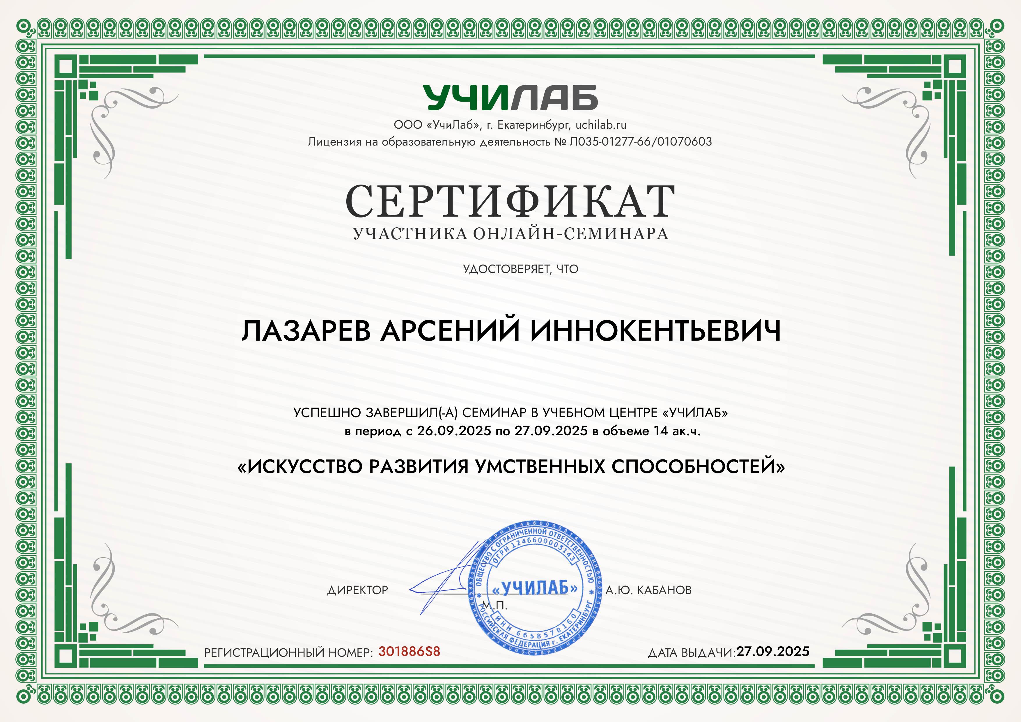 Сертификат участника онлайн-семинара "Искусство развития умственных способностей" (учебный центр "Училаб", 27.09.2025)