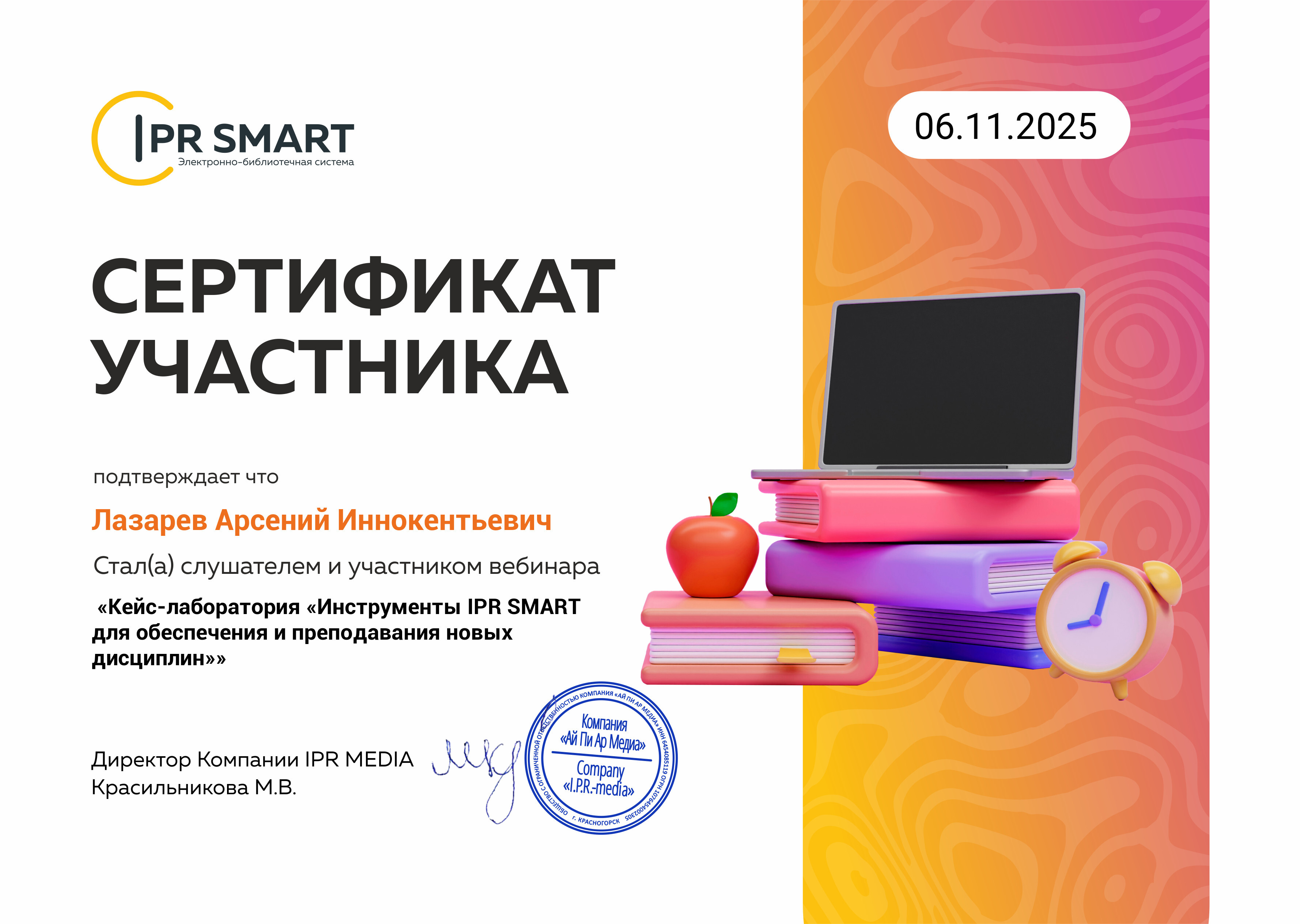 Сертификат участника кейс-лаборатории "Инструменты IPR SMART для обеспечения и преподавания новых дисциплин" (06.11.2025)