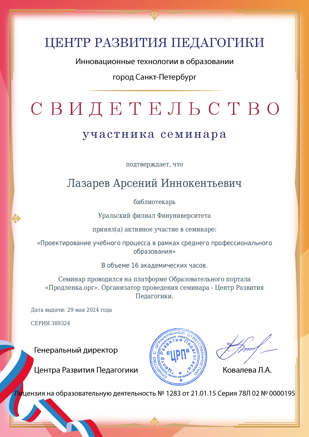 Свидетельство участника семинара "Проектирование учебного процесса в СПО" (Центр развития педагогики, 29.05.2024)