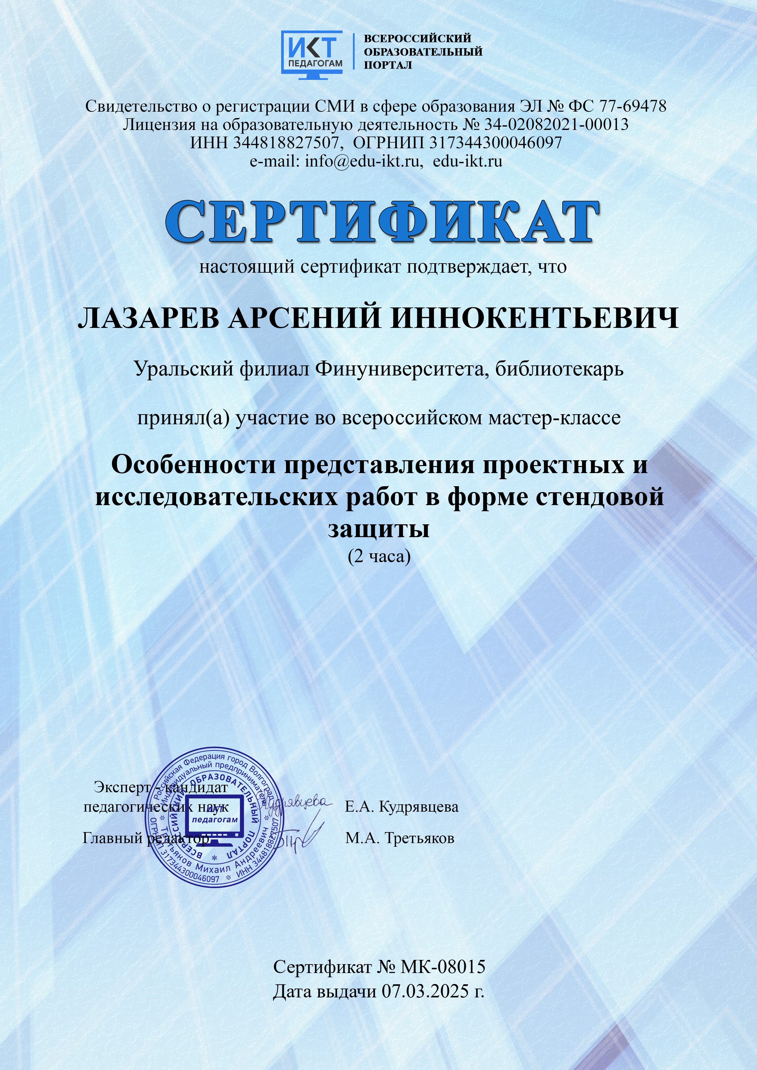 Сертификат участника мастер-класса "Особенности представления исследовательских работ в форме стендового доклада" (образовательный портал "ИКТ - педагогам",07.03.2025)