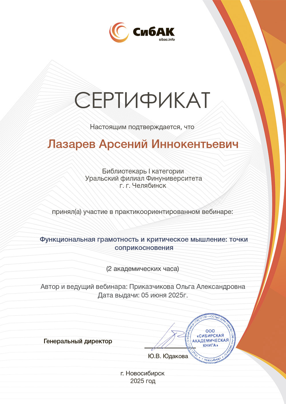Сертификат участника вебинара "Функциональная грамотность и критическое мышление: точки соприкосновения" (СибАК, 05.06.2025)